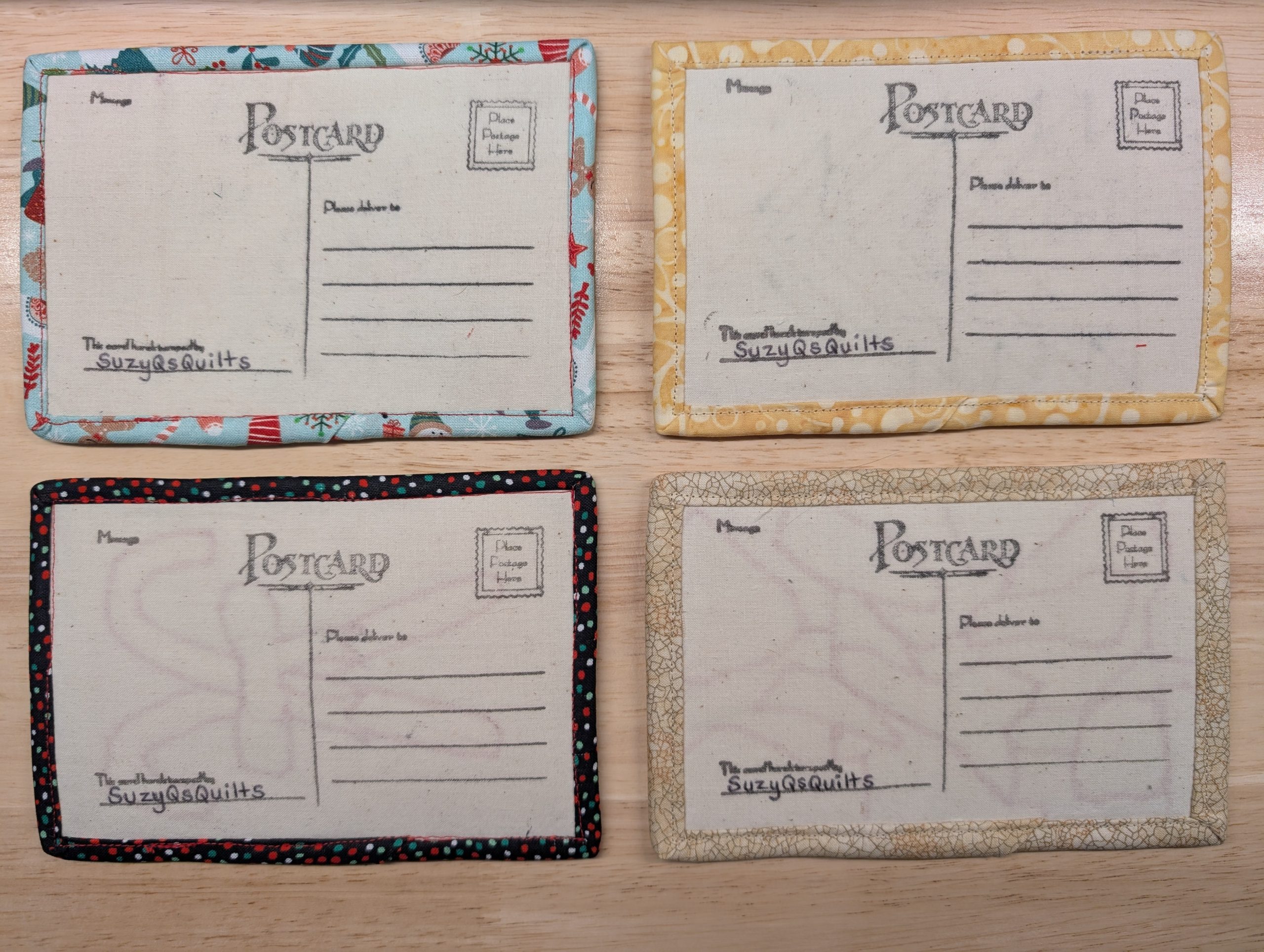 This set includes 4 quilted fabric postcards measuring 4×6 inches. Each postcard can be written on and mailed through the USPS with a standard letter stamp (not a postcard stamp).