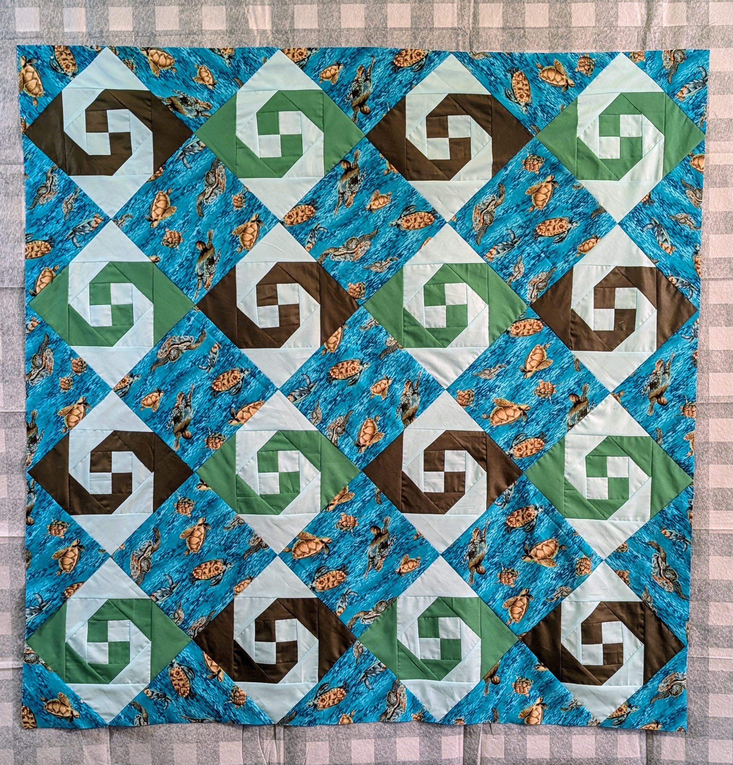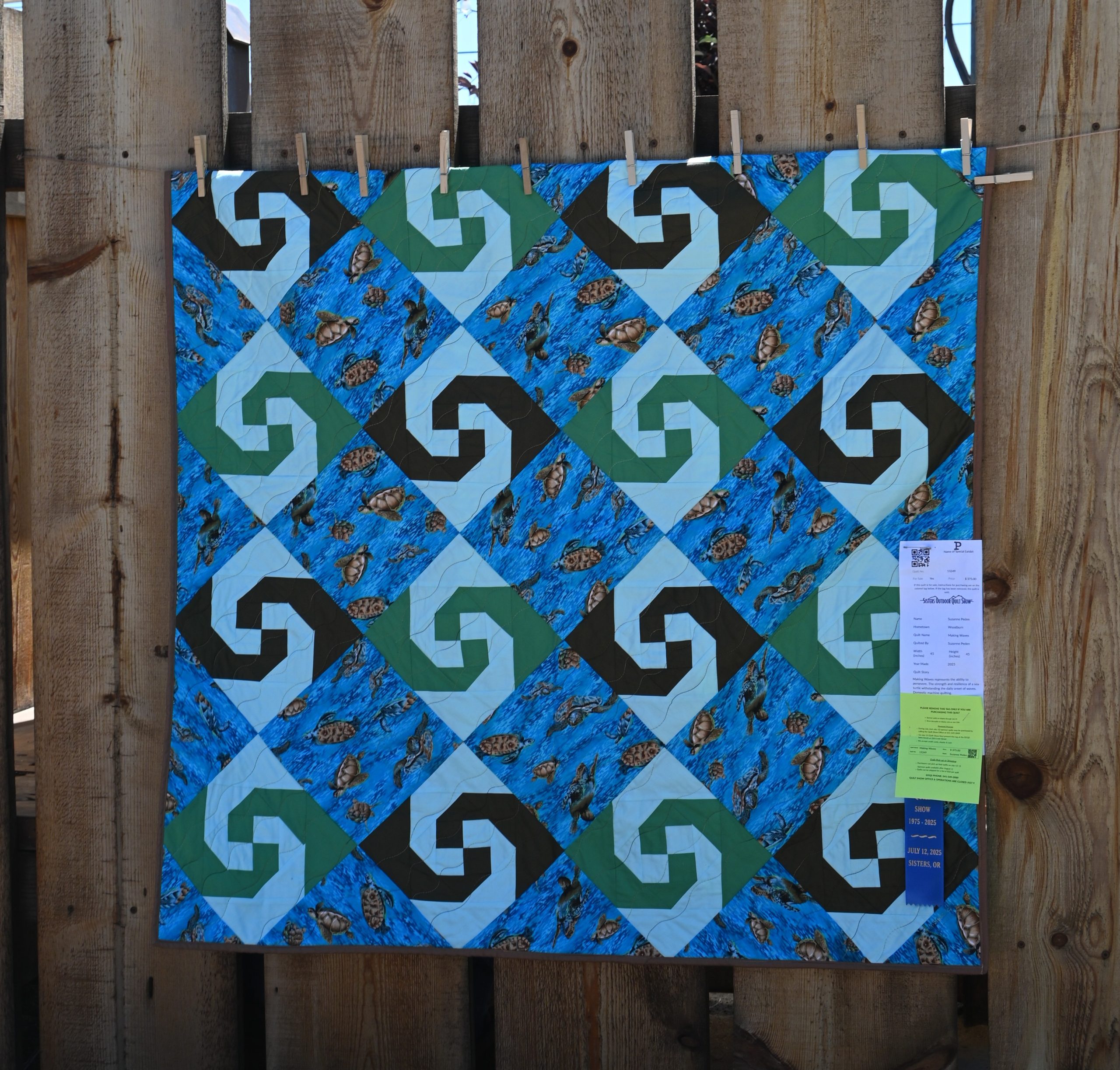 Making Waves represents the ability to persevere. The strength and resilience of a sea turtle. The quilt measures 45×45 inches, is machine pieced and freehand machine quilted. Making Waves was on exhibit at the 50th Annual Sisters Outdoor Quilt Show in July 2025. The quilt show entry tags are still attached.